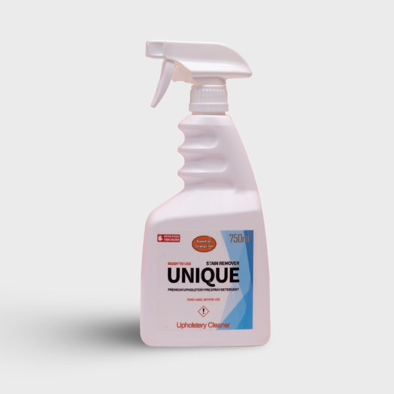 Unique is a professional upholstery pre-spray detergent, based on natural orange oil. Formulated specifically for the effective cleaning of all synthetic upholstery fabrics.